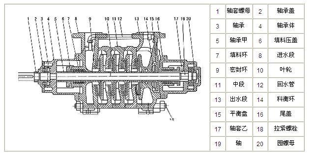 GC型水泵的主要零件有軸、軸套、進水段、葉輪、導翼、密封環(huán)、中段、出水段、平衡環(huán)、平衡盤、尾蓋。